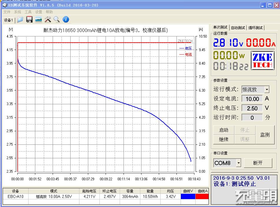3、3号18650(3000mAh,20A)动力电池容量测试,10A放电:容量3046mAh ,10.50Wh,均压3.42V,实测电池容量超出标称的3000mAh 。