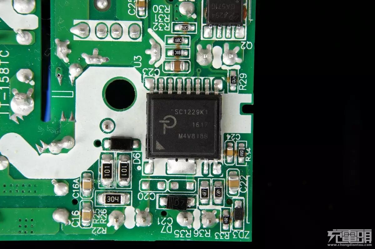 USB模块,在输入方面我们看到了一颗绿色的防浪涌ntc原件,有效避免插排插电时给电容充电产生火花,还有阻燃保险丝加固安全防线,黑色x电容配合共模电感, 组成一级emi滤波电路,防止开关电源工作的高频噪声干扰其他用电设备。我们可以看到不同于一般评测产品,Y电容是两颗串联,这样即使有一颗失效了,也不会发生人身危险,高可靠性做法。在焊线处,线材先通过冷压端子压接后再焊接到PCB上,更加牢固,整个排插内部大量使用灌注白胶来抗震,避免日常使用时以外掉落造成元器件脱出松动,高低压隔离板可以避免以外窜电危险,隔离板做到了壳体上,所以PCB图片看不到。在变压器与SC1223K之间包裹着一层金属铁皮,起到均热与EMI屏蔽的作用。
