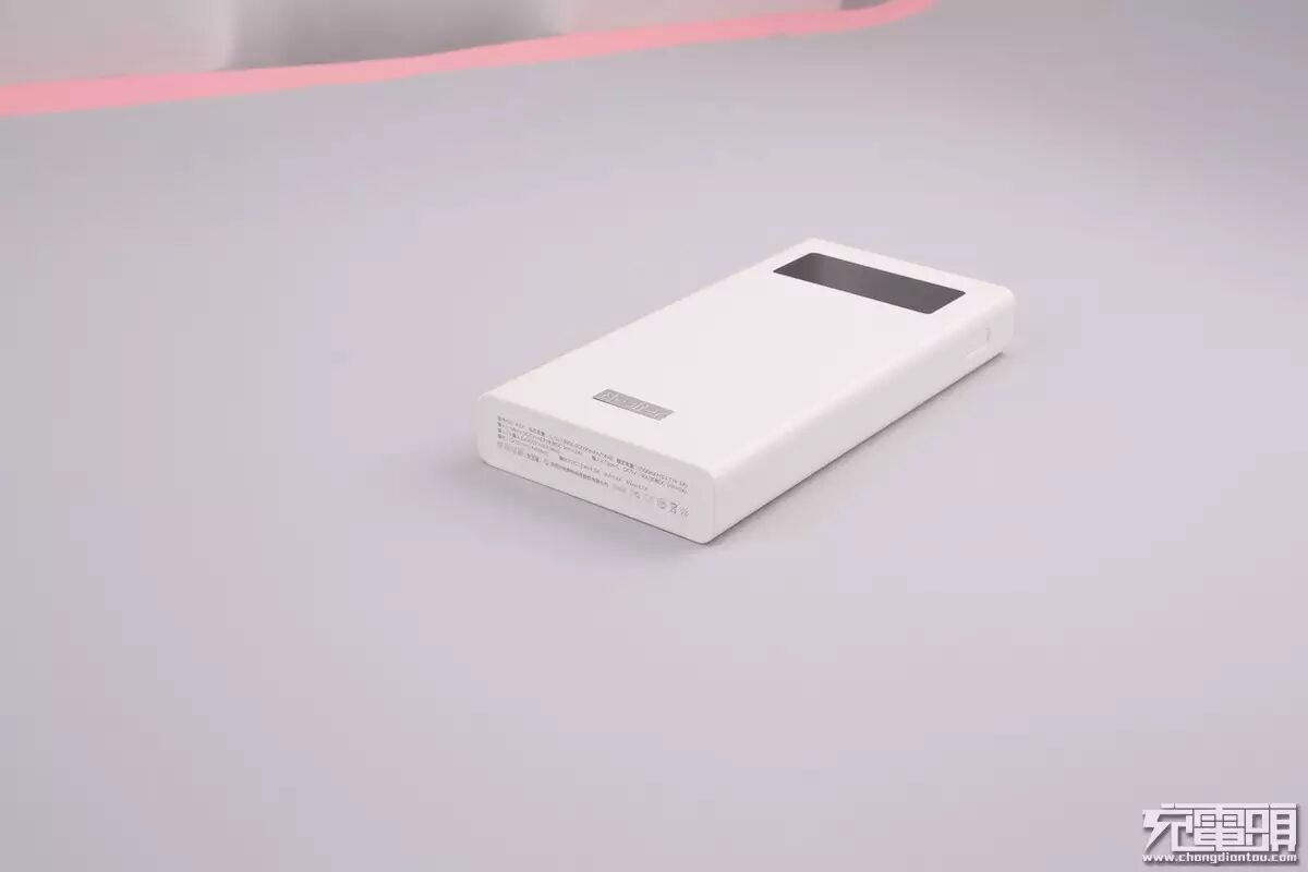 产品白色采用白色包装纸盒,正面印有品牌商标和产品外观图。产品正面的数显屏很显眼,为产品的核心卖点之一。从包装盒上可得知移动电源容量为20000mAh,LED显示屏可以实时显示剩余电量和输出电压。