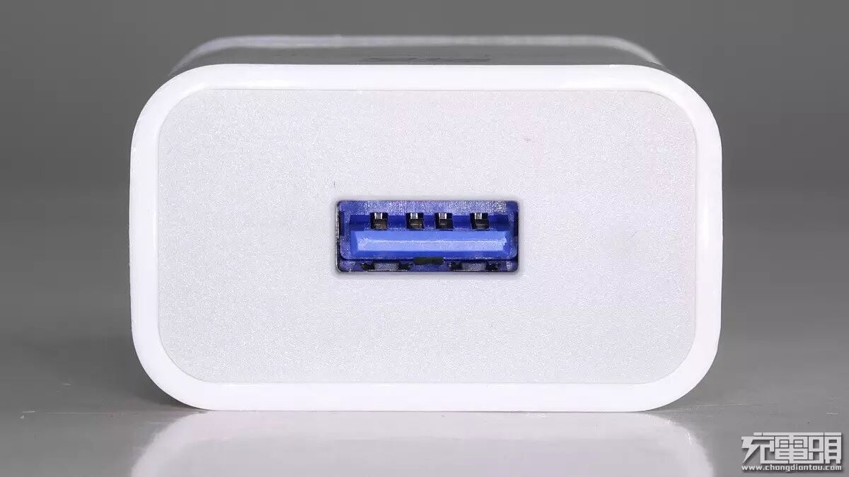顶端USB-A输出端口,蓝色胶舌,有倒棱处理。