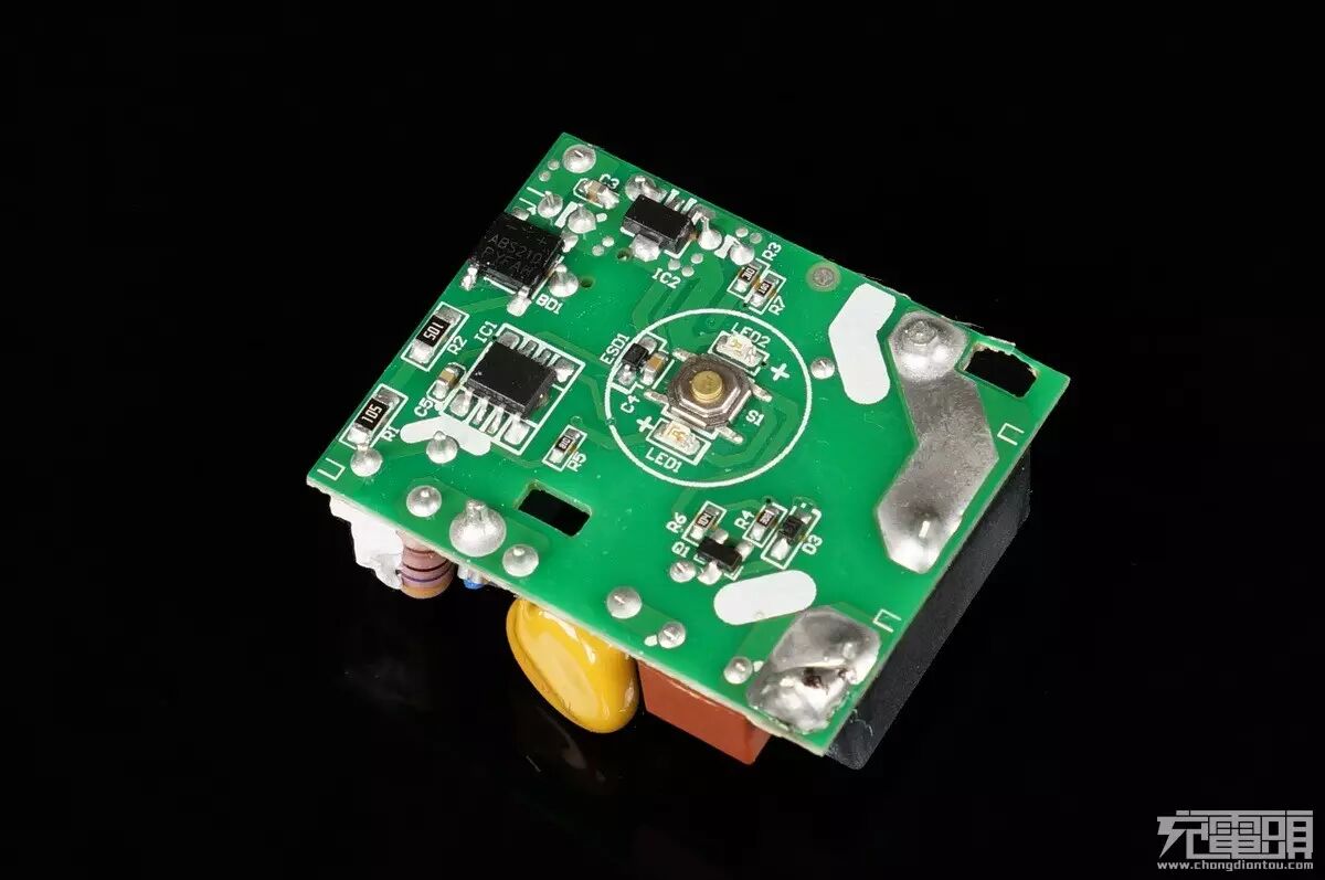 USB模块,在输入方面我们看到了一颗绿色的防浪涌ntc原件,有效避免插插线板电时给电容充电产生火花,还有阻燃保险丝加固安全防线,黑色x电容配合共 模电感, 组成一级emi滤波电路,防止开关电源工作的高频噪声干扰其他用电设备。在焊线处,线材先通过冷压端子压接后再焊接到PCB上,更加牢固,整个插线板内部 大量使用灌注白胶来抗震,避免日常使用时以外掉落造成元器件脱出松动,高低压隔离板可以避免以外窜电危险,隔离板做到了壳体上,所以PCB图片看不到。在 变压器与SC1223K之间包裹着一层金属铁皮,起到均热与EMI屏蔽的作用。