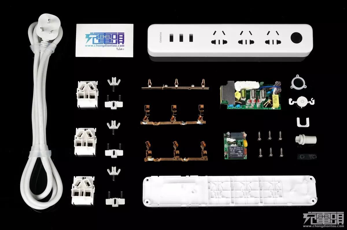 所有部件拆解一览,从左到右是线缆、AC舱门、一体铜条、USB模块与开关模块、线缆接线口与光环开关按钮、面盖底盖。