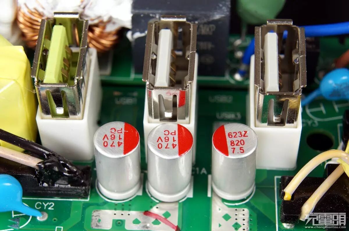 固态电容同样是来自AiSHi艾华,16V470uF x2 负责绿色快充口滤波,7.5V820uF负责普通5V口滤波,3个USB母座都没有磁吸反应,并且底座都有塑料套加固抵抗插拔摇晃。