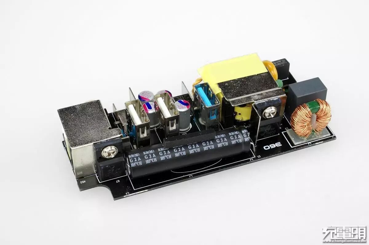 第一眼看上去,这个USB模块几乎是所有USB插线板里最大的,比大多数USB插线板的USB模块体积大了一半,360这个USB模块可以看到由两个独立的变压器做到双路独立输出。