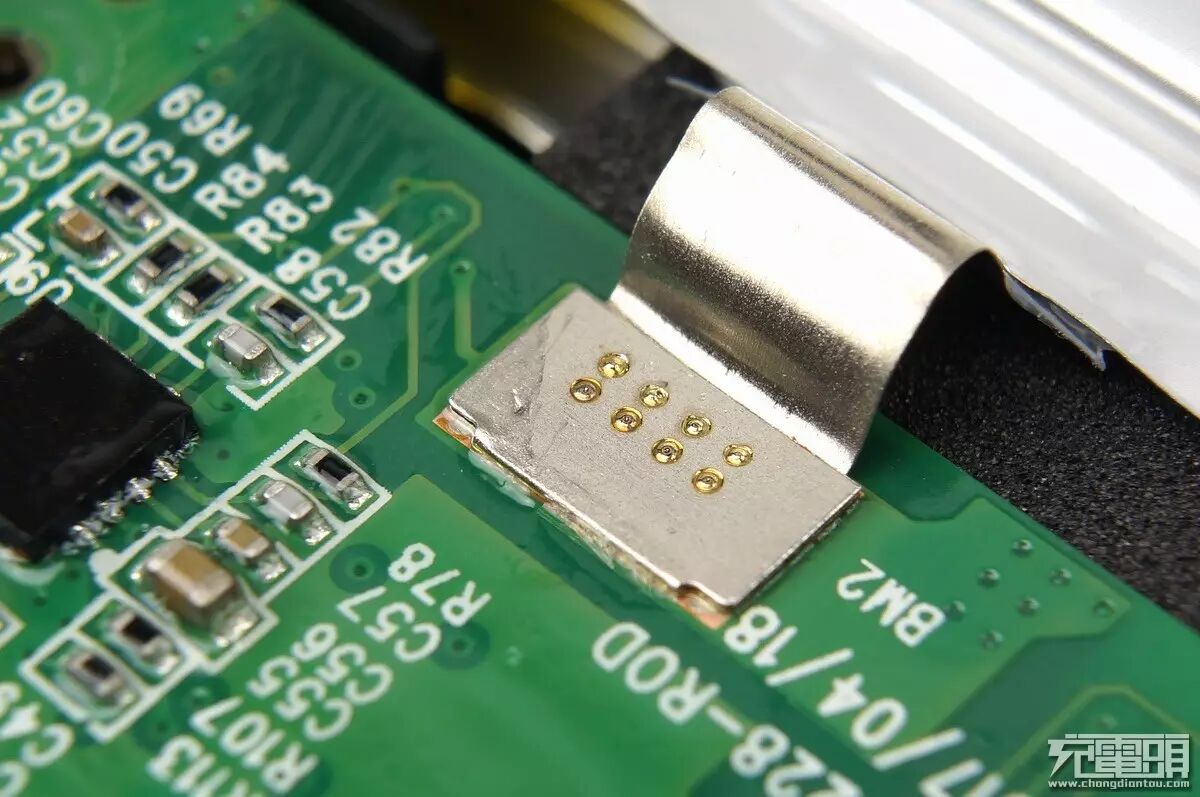 移动电源使用了内框架设计,把PCB与电池保护并包裹起来,PCB独立遮盖电池底部的缓冲隔板厚度十足。