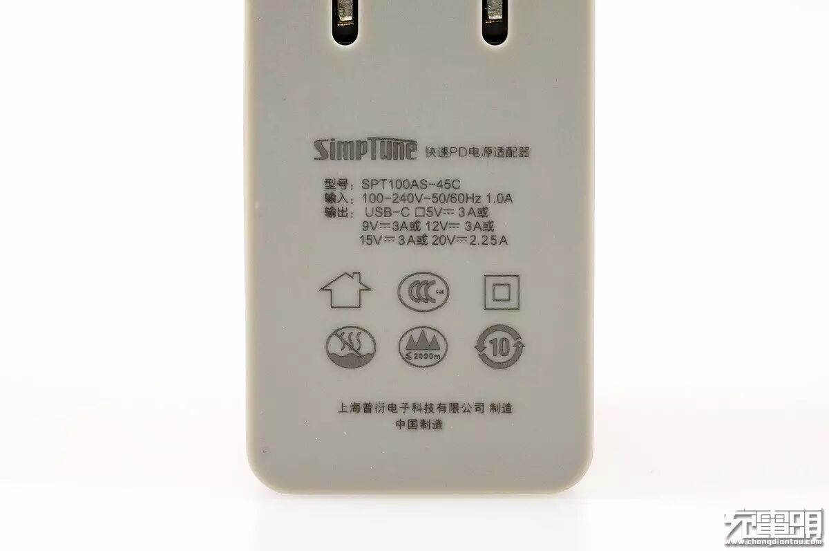 产品名称:SIMPTUNE快速PD电源适配器、产品型号:SPT100AS-45C、接口类型:USB-C、输入参数:100-240V~50/60Hz 1.0A、输出参数:5V/9V/12V/15V=3A,20V=2.25A。