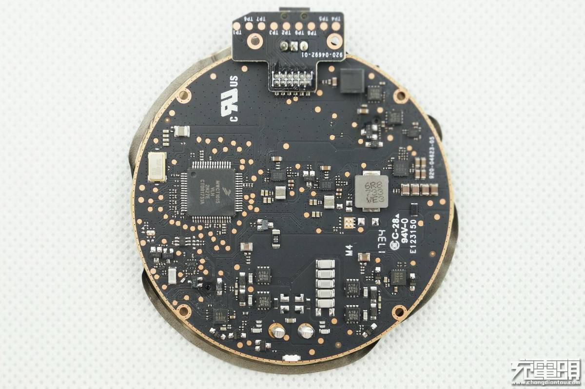 丝印为CP-SC2的芯片品牌来自易冲无线,为整个无线充的核心,这是一颗专门为无线充电应用设计的单输入电源管理芯片。通过串口总线,CP-SC2可以与外部MCU通信,从而获取信息来驱动电池充电芯片。集成于芯片内部的功率管驱动可以直接控制外部功率管的开关,芯片同时内置了检测电路,当检测到过流、过压等情况时,会自动关闭功率管。