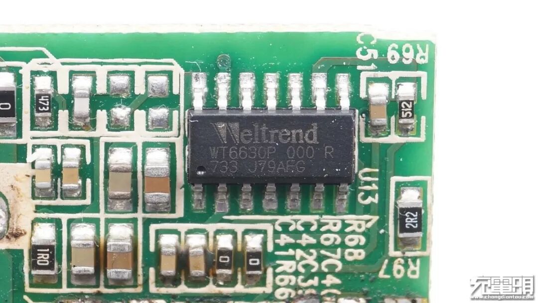 USB PD输出控制器由伟诠Weltrend提供,型号WT6630P。支持USB PD快充,并具有5V、9V、15V、20V四挡电压输出。这颗芯片也被联想、惠普等品牌的USB-C充电器采用。
