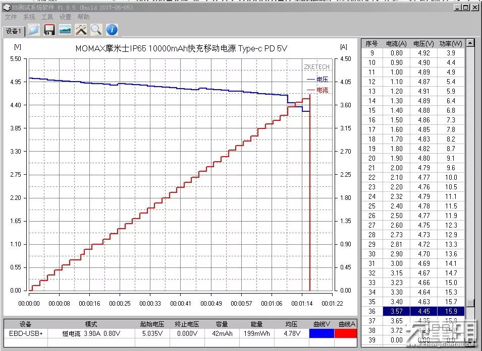 最大功率15.9W,超过标称的18W,此时电流输出3.57A、电压4.45V。