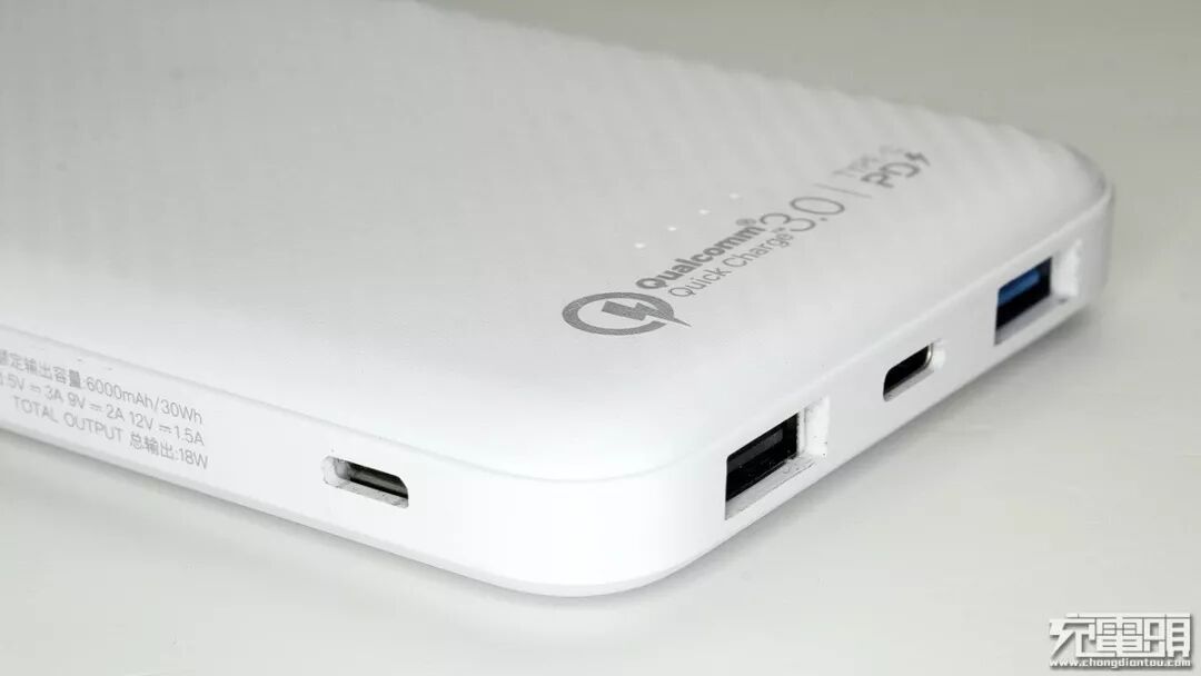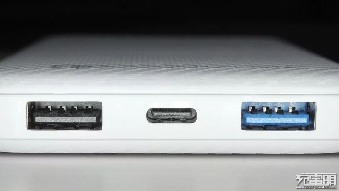 正面左右分列USB-A输出插孔各一,中间是Type-C插孔,其中Type-C支持 PD 18W双向快充输入输出。