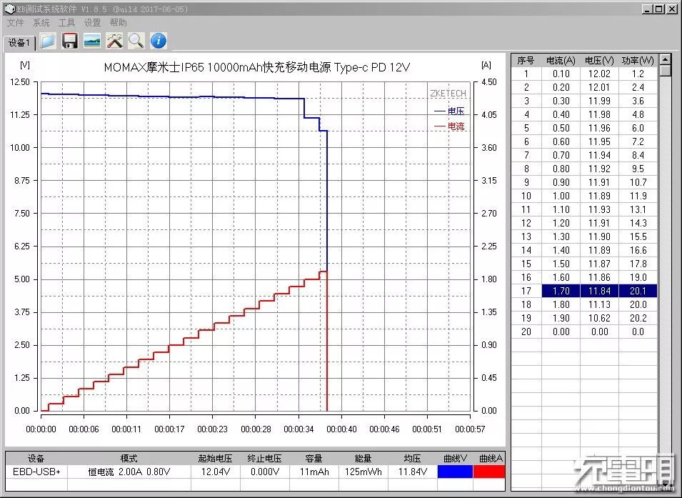 最大功率20.1W,超过标称的18W,此时电流输出1.7A、电压11.84V。随着输出电压的升高,线阻的影响也在逐渐变小,实质上排除转接因素外PD与QC等快充模式下,在同等电压下的输出能力是一致的。