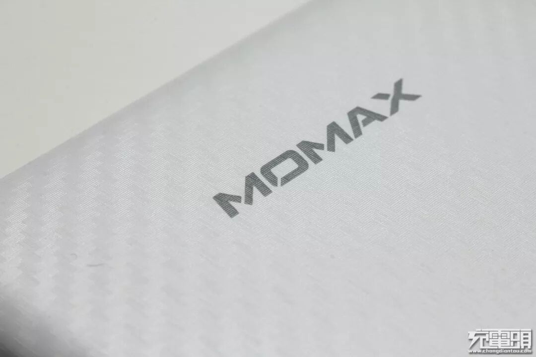 产品正面,上部是 MOMAX摩米士的英文logo,下方印有QC3.0、Type-C PD的快充标识。4颗LED电量显示孔,其中第一颗LED在输入、输出快充模式激活时会变成绿色提示。