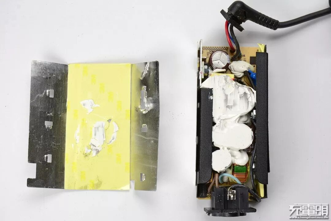 开关变压器上有大量的硅酮导热胶,依靠金属屏蔽罩起到辅助散热的作用。