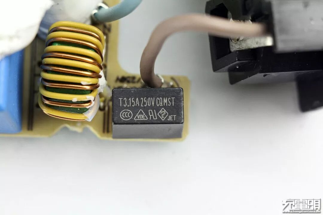 黑色台湾功德T3.15A 250V CQ MST方形慢熔/延时保险丝,一线大厂必备。其后是一级EMI共模电感,漆包线、胶线双线并绕绝缘防止击穿。