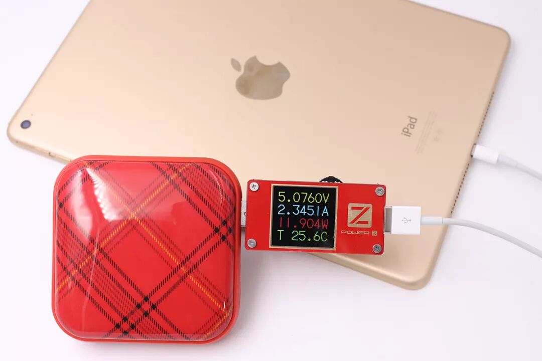 给iPad Air2(剩余23%电量)充电,5.07V/2.34A,功率约11.9W,基本处于满速充电状态。