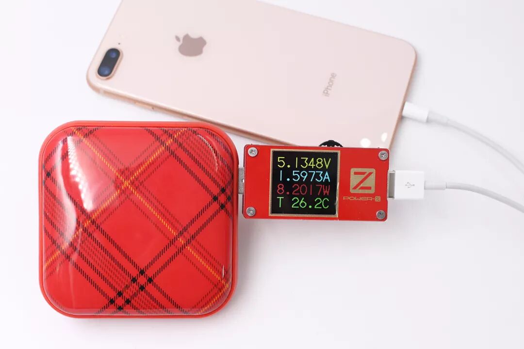 测试时由于iPhone 8 Plus电量比较满,接近70%,所以充电电流只有1.6A左右。不过对于iPhone来说,70%电量对应8W的充电功率,这已经是很不错的充电速度了。
