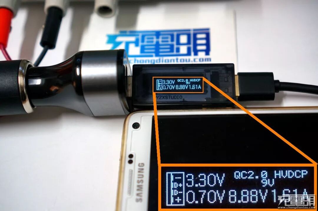 上车测试,尽管有着高达72W的惊人输出能力,身段却如软妹般小巧。插入点烟器插孔后外露并不多,电源接通后有微微的淡蓝色灯光从USB母座折射出来告知你臣妾正在工作着。