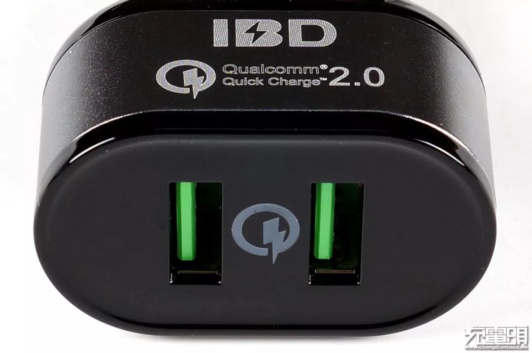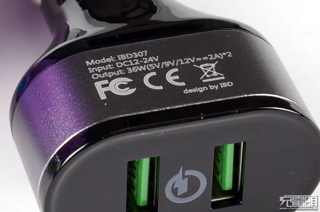 主机细节部分,IBD 307 全身由黑色塑料+银黑灰铝外壳组装而成手感质感档次都非常赞。塑料部分采用喷涂钢琴漆造出镜面效果而且光滑度很高,铝壳表面喷砂再电镀而成,主要信息都印刷在这个铝壳上。IBD商标下是醒目的Qualcomm Quick Charge 2.0 LOGO 让人一眼可辨认这款产品支持高通2.0的快充标准,两个USB母座选用了清新显眼的绿色底座,中间同样印刷着高通快充LOGO。铝壳背部的是产品主要参数,型号:IBD307、输入:12V~24V 小轿车与大货车全兼容、输出:(5V2A/ 9V2A/ 12V2A)36Wx2,也就是说双口一共72W!