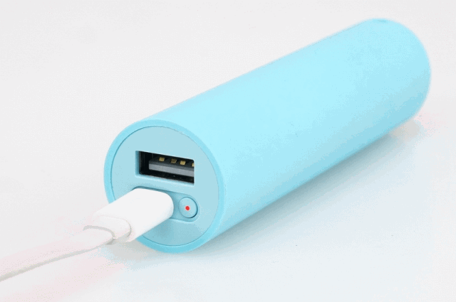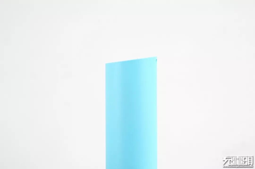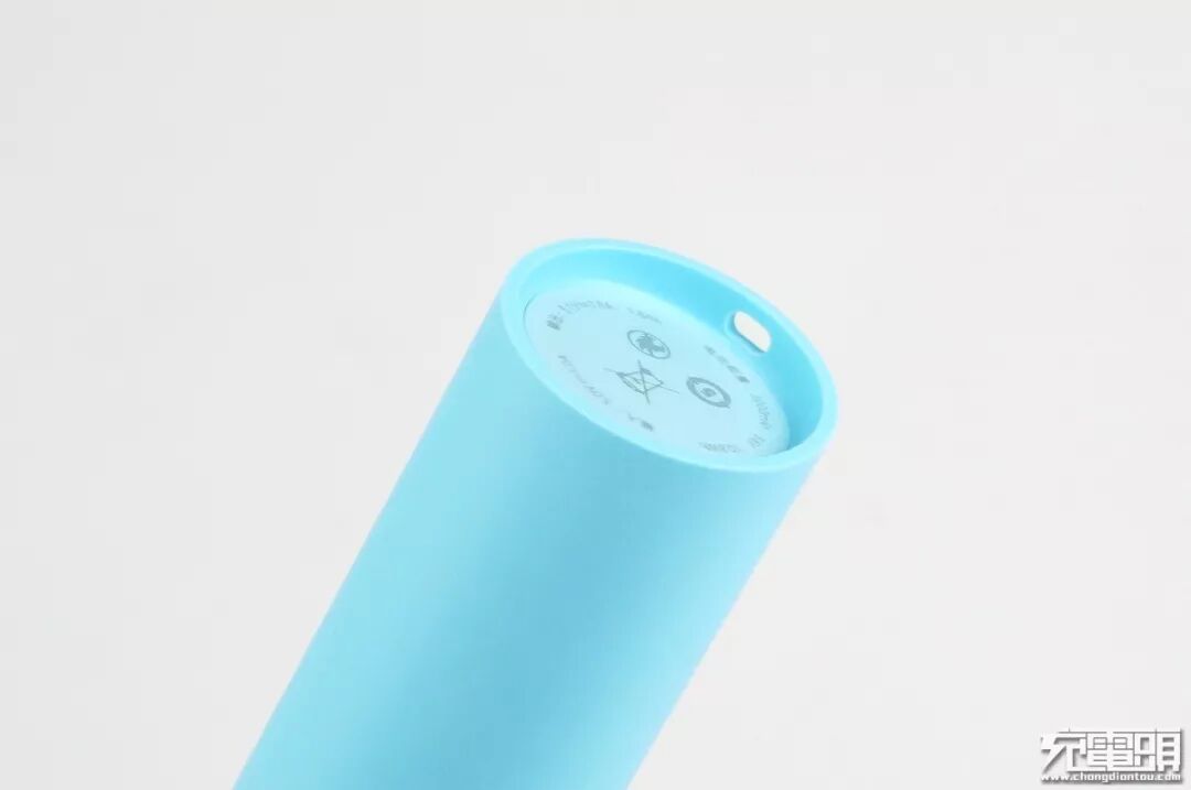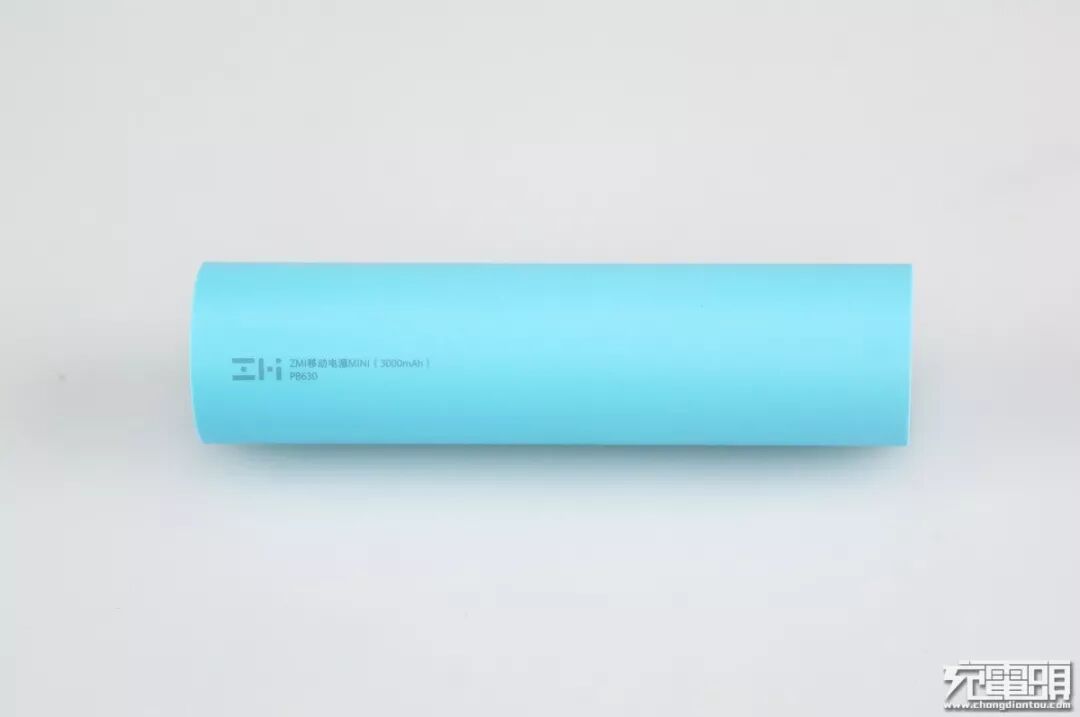 ZMI移动电源MINI与口红尺寸相仿的圆筒采用了松石蓝色彩塑胶壳体制作,壳体表面印刷着产品信息:ZMI移动电源MINI(3000mAh) PB630。
