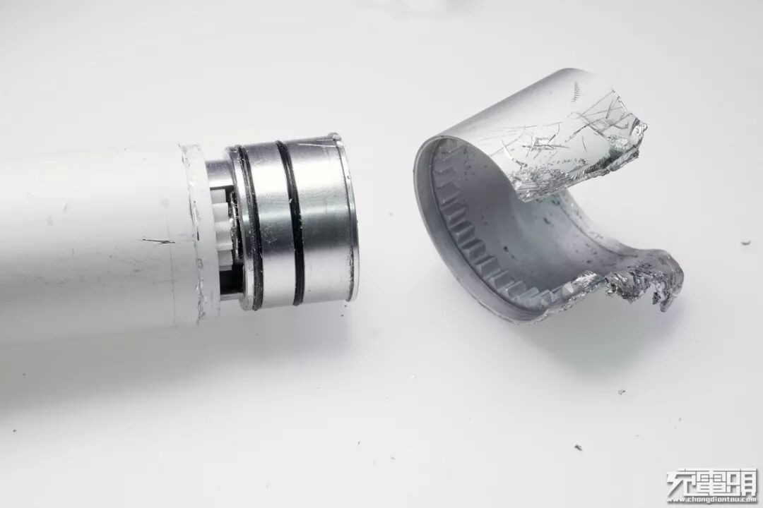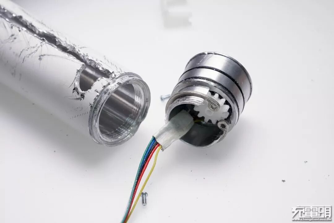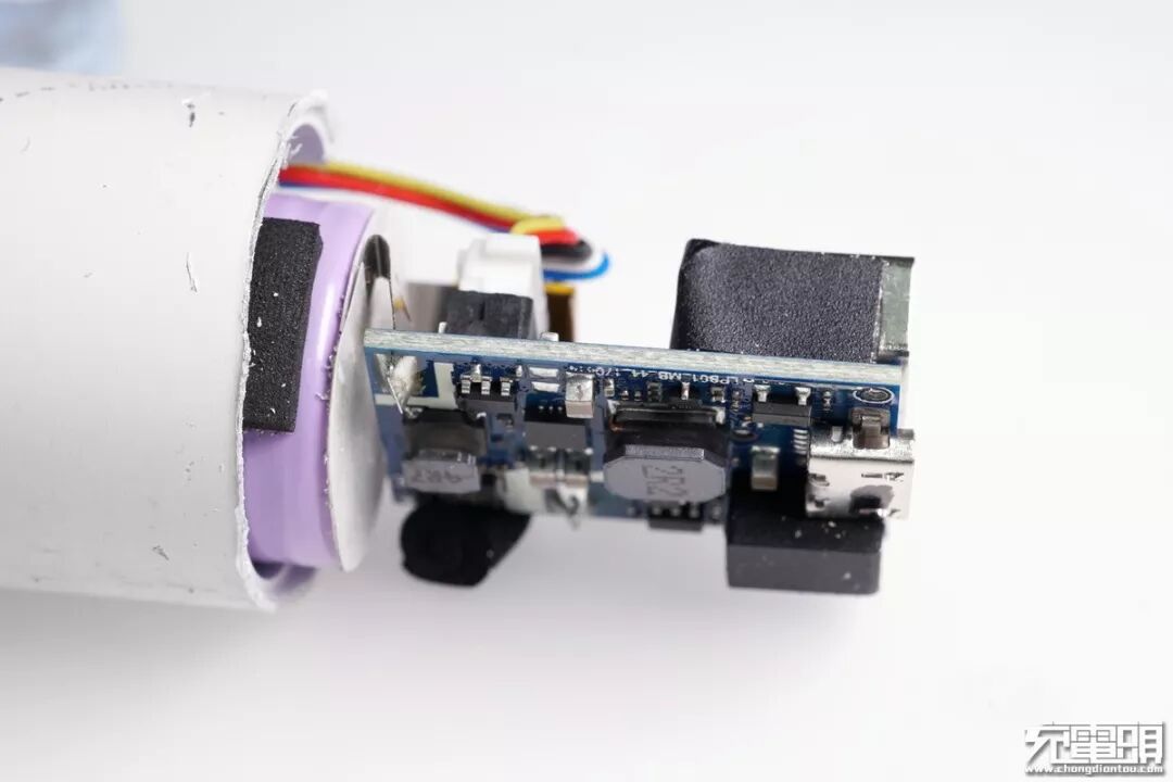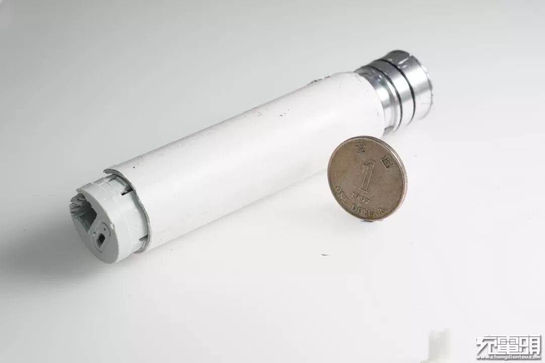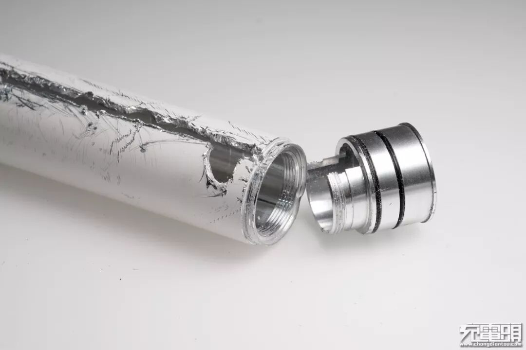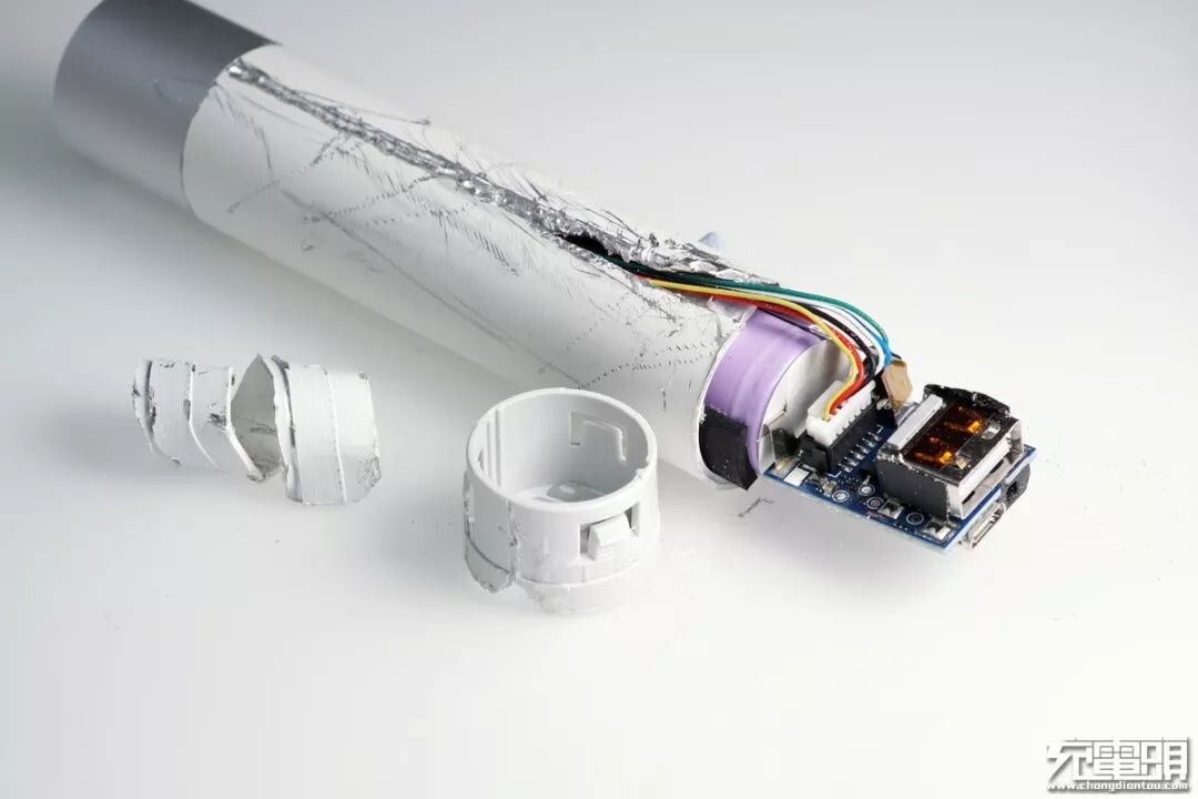 壳体厚度达到2.65mm,可以抵御摔落不变形甚至人直接踩上去也没事,内部左右突起的是PCB滑槽,PCB通过滑槽固定推入,上面突起的是顶住电池体的限位柱,可以看到壳筒比电池大了不少还有不少空间。为什么壳体要做成这么大?可能是为了方便装配又或者是冲击时的缓冲距离,也有可能为了以后采用高容量20700预留的位置?