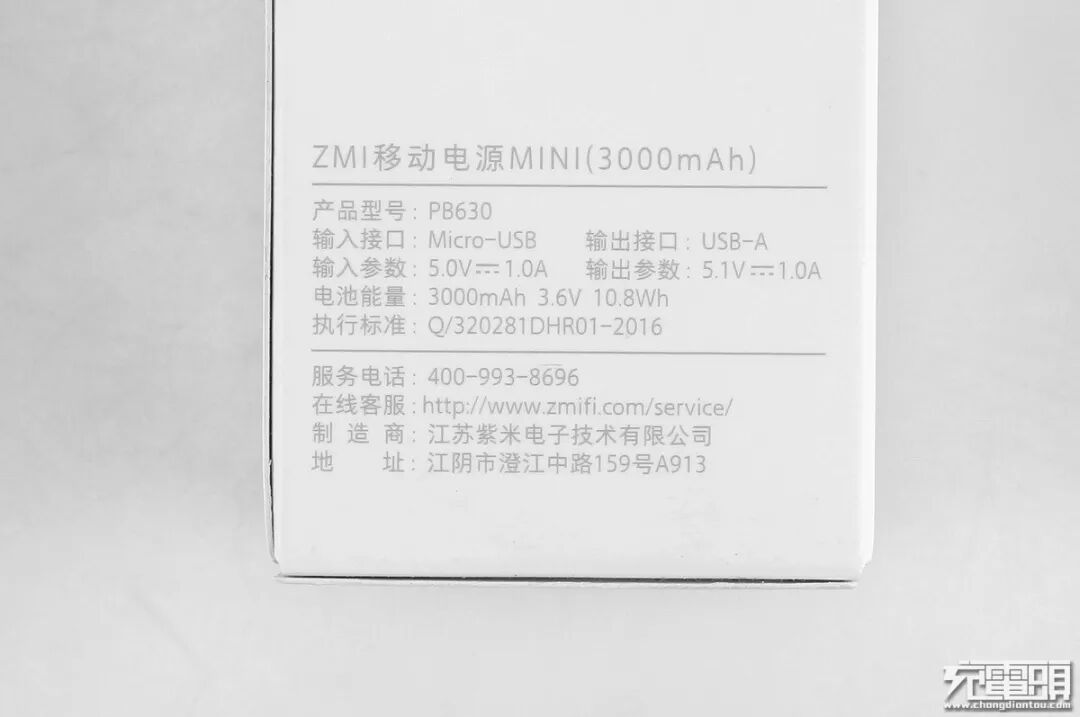 包装名牌参数如下,品名:ZMI移动电源MINI(3000mAh)、产品型号:PB630、输入接口:MicroUSB、输出接口:USB-A、输入参数:5V1A、输出参数:5.1V1A、电池能量:3000mAh 3.6V 10.8Wh、制造商:江苏紫米电子科技有限公司。