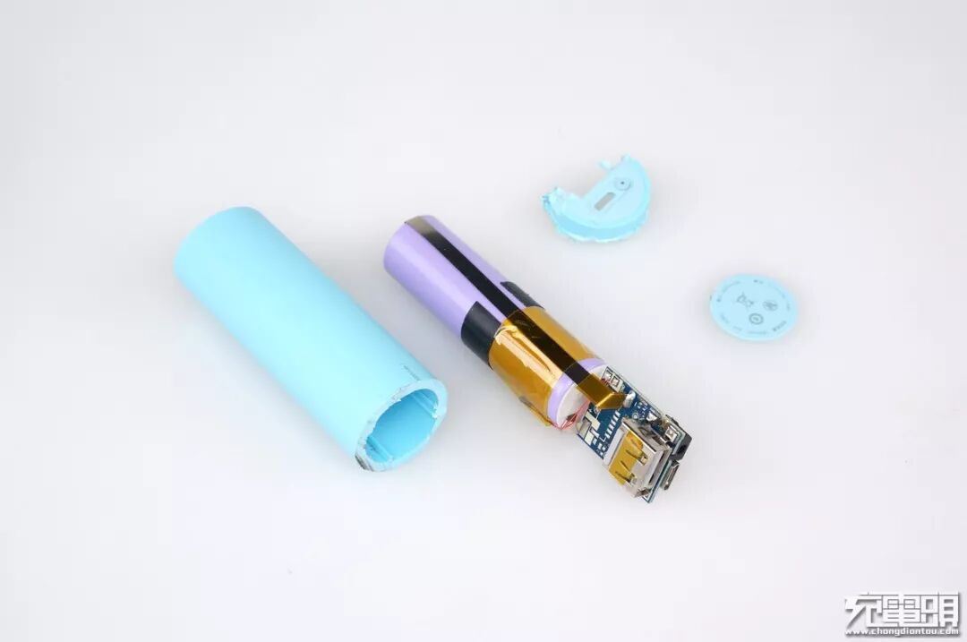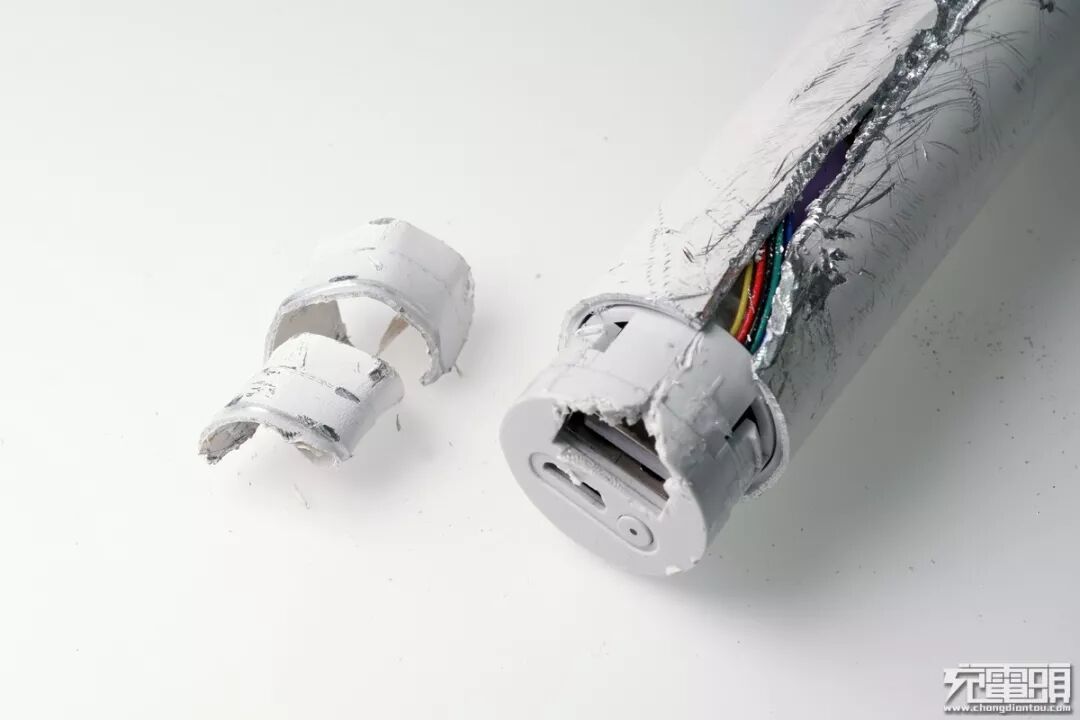 紫米移动电源MINI装配方式是电池体+PCB滑入壳筒内,再压入接口面板进行限位固定,一体性强无法无损拆开。