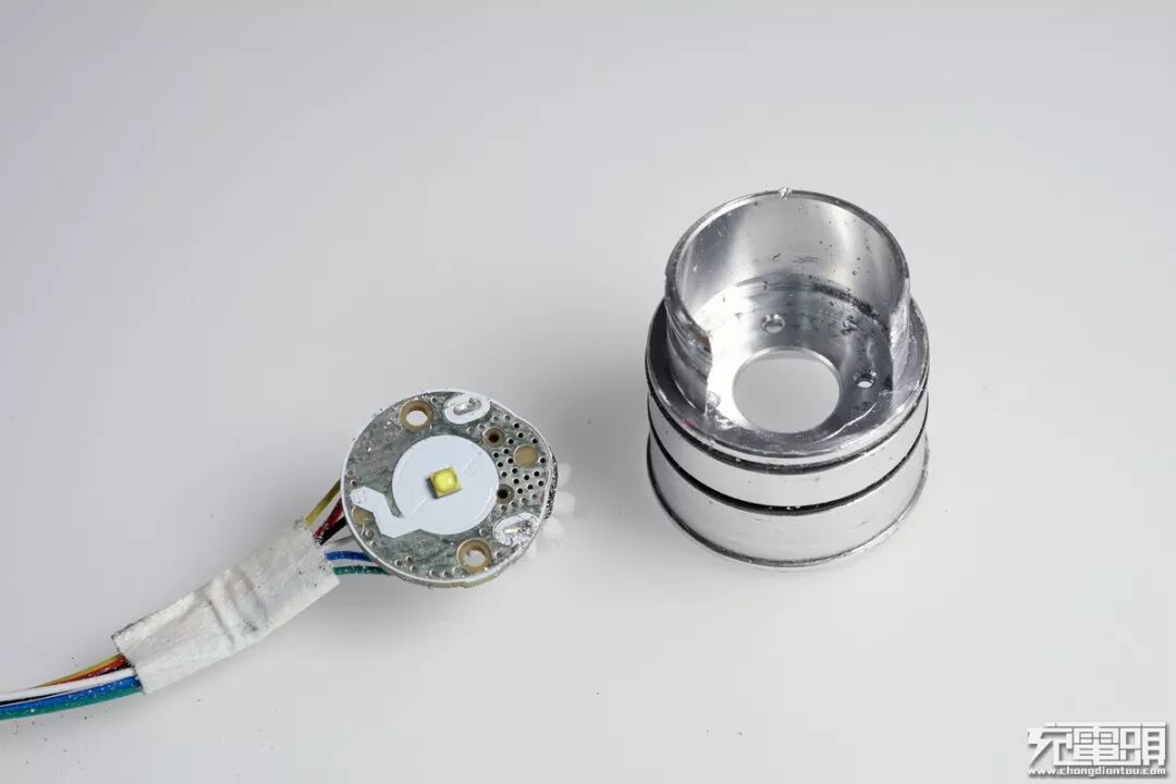 电路仓可以直接扭开,有螺纹。电路仓白色齿轮,通过调光圈转动调光。