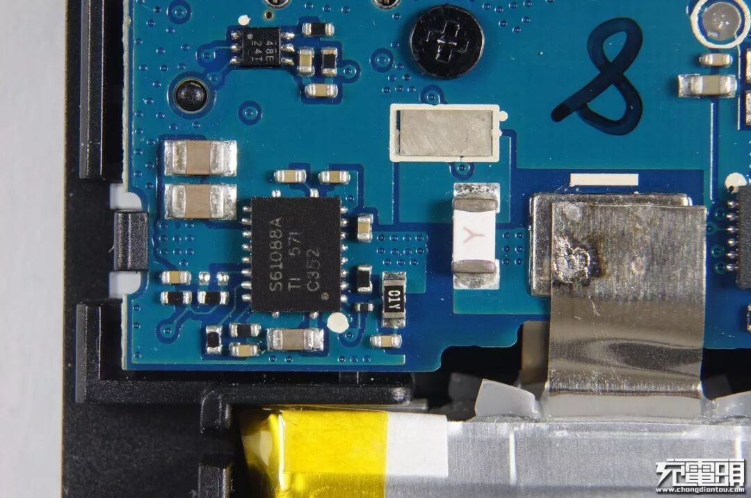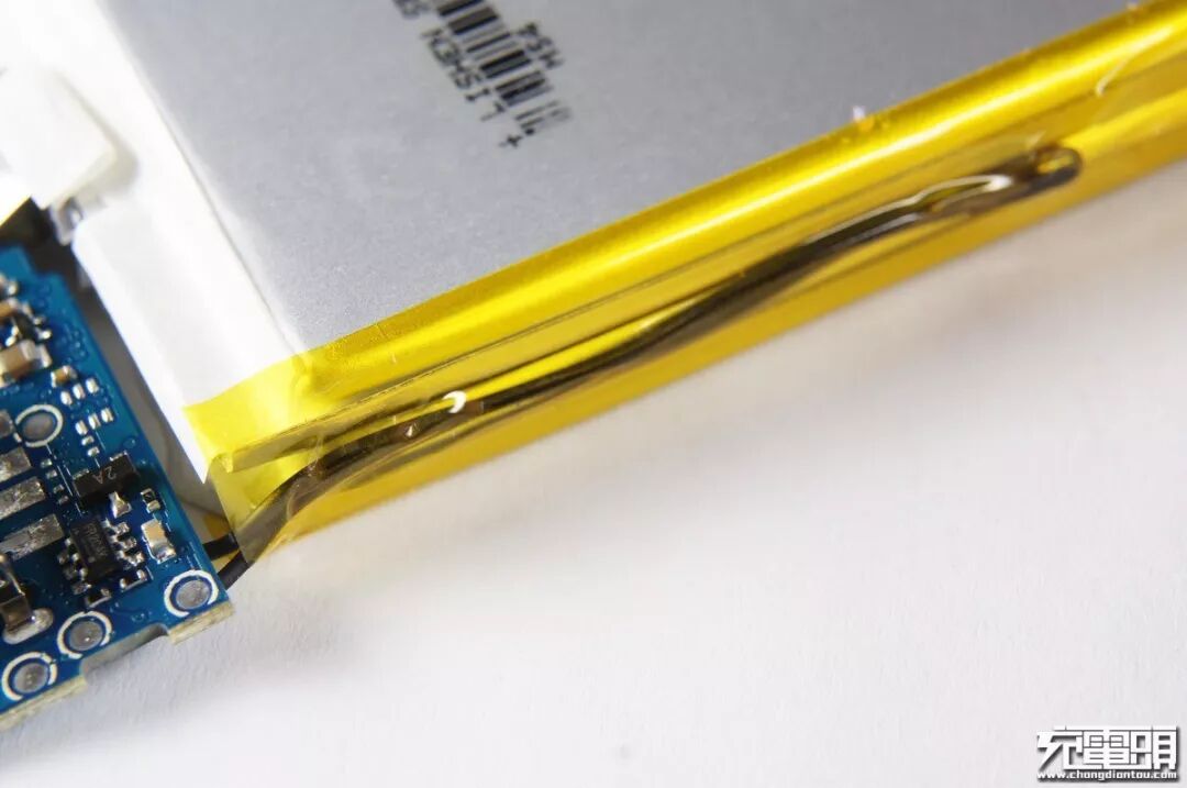 ucsp封装MOS旁边是电池管理IC,他们搭配组成保护板,白色保险丝作最后一道安全防线。