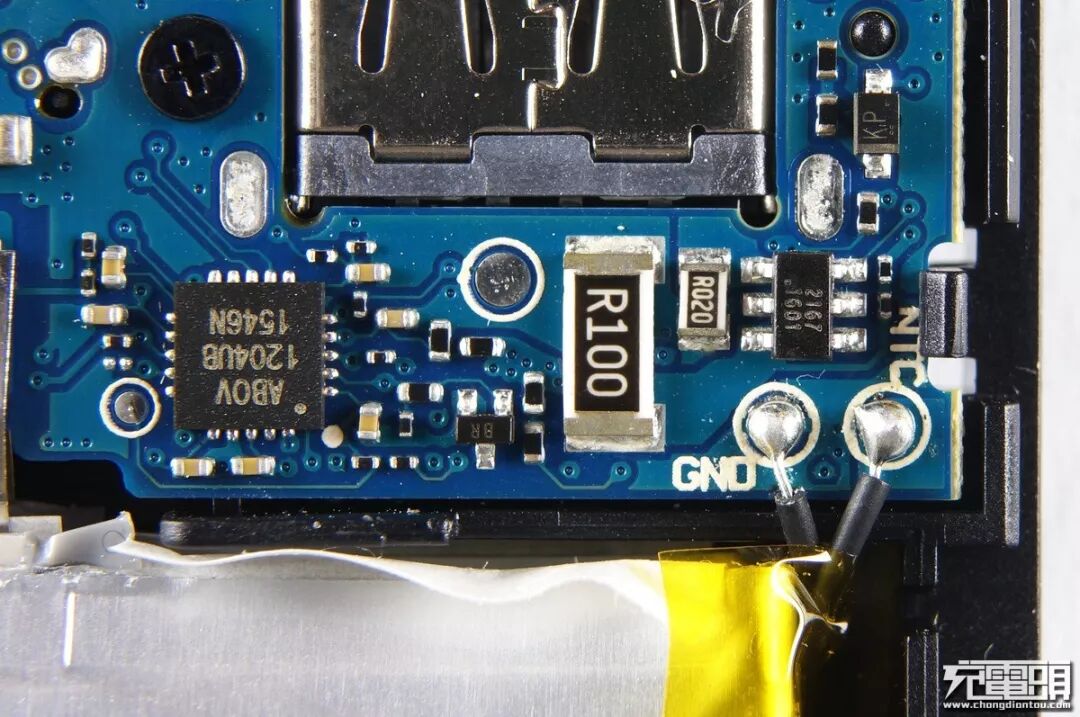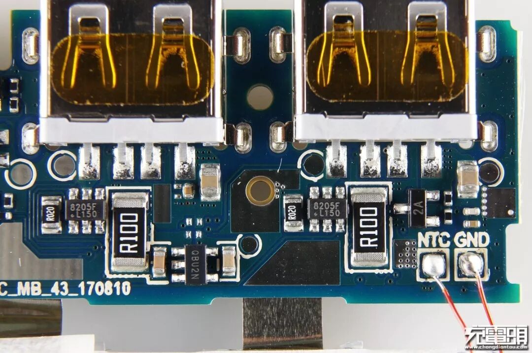 小米移动电源的电池组PACK工艺一直都是业内一流的,电池组前沿贴上了美纹胶纸绝缘保护,两块电芯一共4条镍带,这里说一下业界常见的电池组连接方式:①先把两块电池的镍带并联点焊,再把过长的镍带折叠起来点焊到PCB上,②同样把两块电池镍带并联点焊然后焊接导线飞线到PCB上。这两种方式虽然人工组装起来方便但过长的导线会让效率值降低,折叠起来的镍带也会产生安全隐患。小米这一款高配版通过在PCB正反面同时点焊的方式连接两片电池,镍带长度最短而且无折痕,值得点赞。