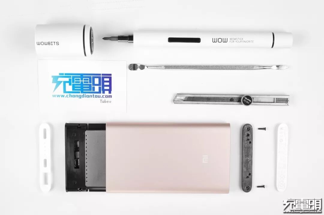 外壳终于分离开来,小米移动电源高配套专版拆解所需用到的工具有:常规十字螺丝刀、撬棒、还有刀片。