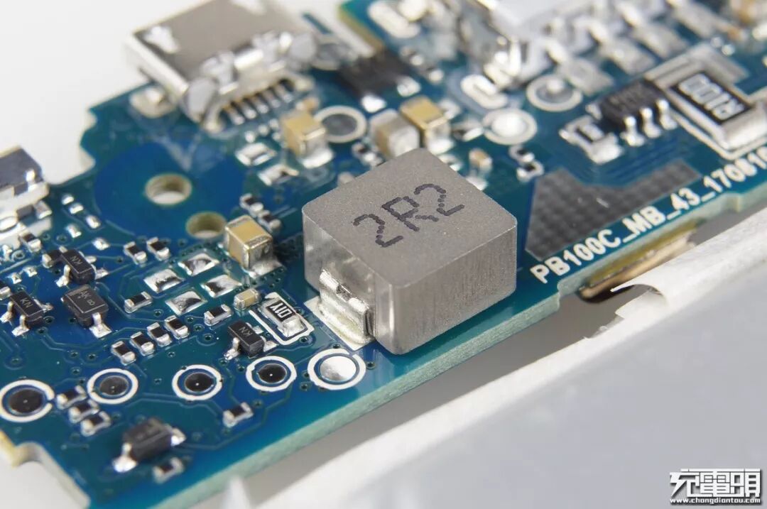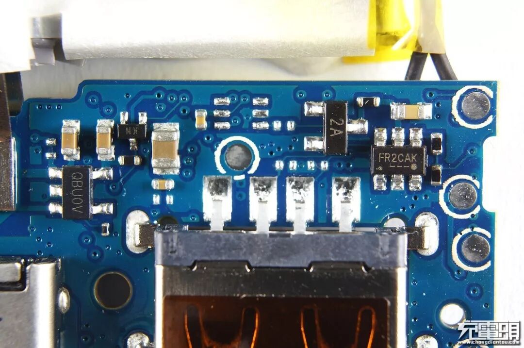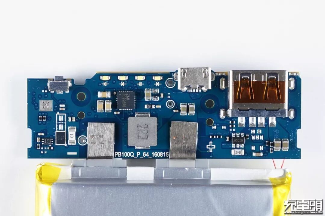小米移动电源2在方案选择方面舍弃了高配版里使用的高端方案TPS61088+BQ25895,采用紫米全新自主研发的电源管理芯片ZMI P02Q6RB,这颗芯片集成了升降压以及协议识别,集成度高,在一定程度上可以降低生产成本。