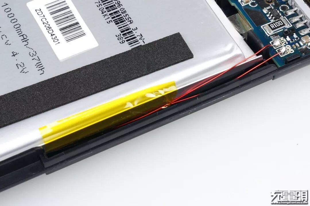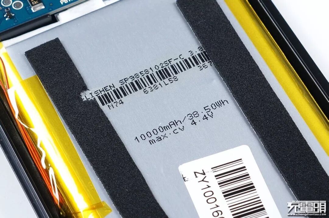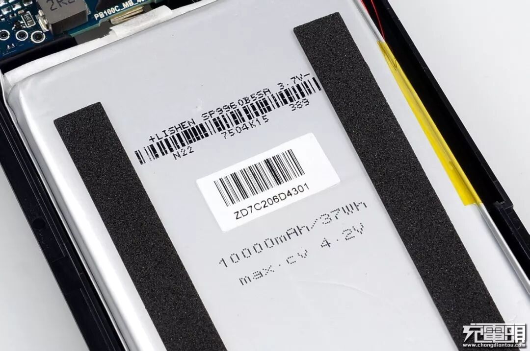 内框架把电池与PCB包裹起来,并且都是独立的仓位互不影响,电芯上贴有防止摩擦的海绵缓冲胶带。