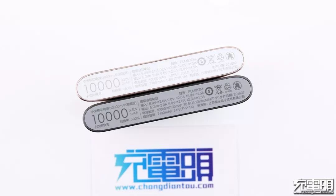 底部的是铭牌信息,型号为PLM01ZM,输入5V2.0A/9V2.0A/12V1.5A,输出同样是5V2.0A/9V2.0A/12V1.5A,明确标注了双向快充,电池容量10000mAh最小值/10180mAh常规值,电池能量38.5Wh最小值/39.19Wh常规值,还标注了5V1A额定输出容量为7100mAh,转换率>90%,电池是均压3.85V的超高压高密度聚合物电池,制造商是江苏紫米电子技术有限公司。