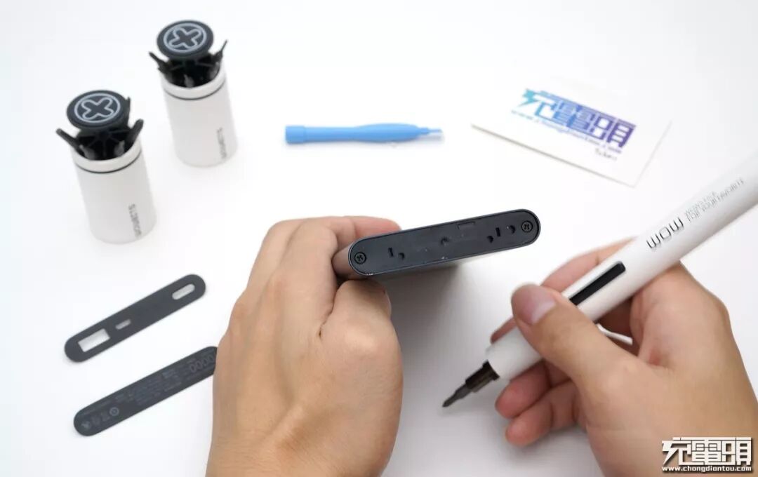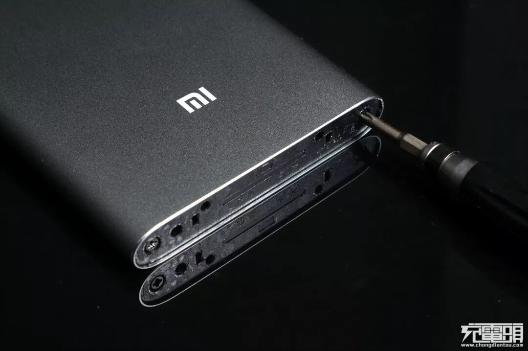 小米所有铝壳款式移动电源拆解方式都一样,结合用的螺丝都在胶片下面,所以我们先把顶部胶片分离。