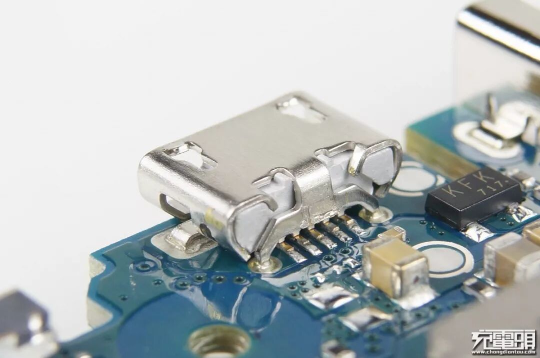 铜质MicroUSB输入母座过孔焊接,可以看到尾部直接穿过PCB焊接拉紧,保护内藏的针脚不会被插拔摇晃造成脱焊。