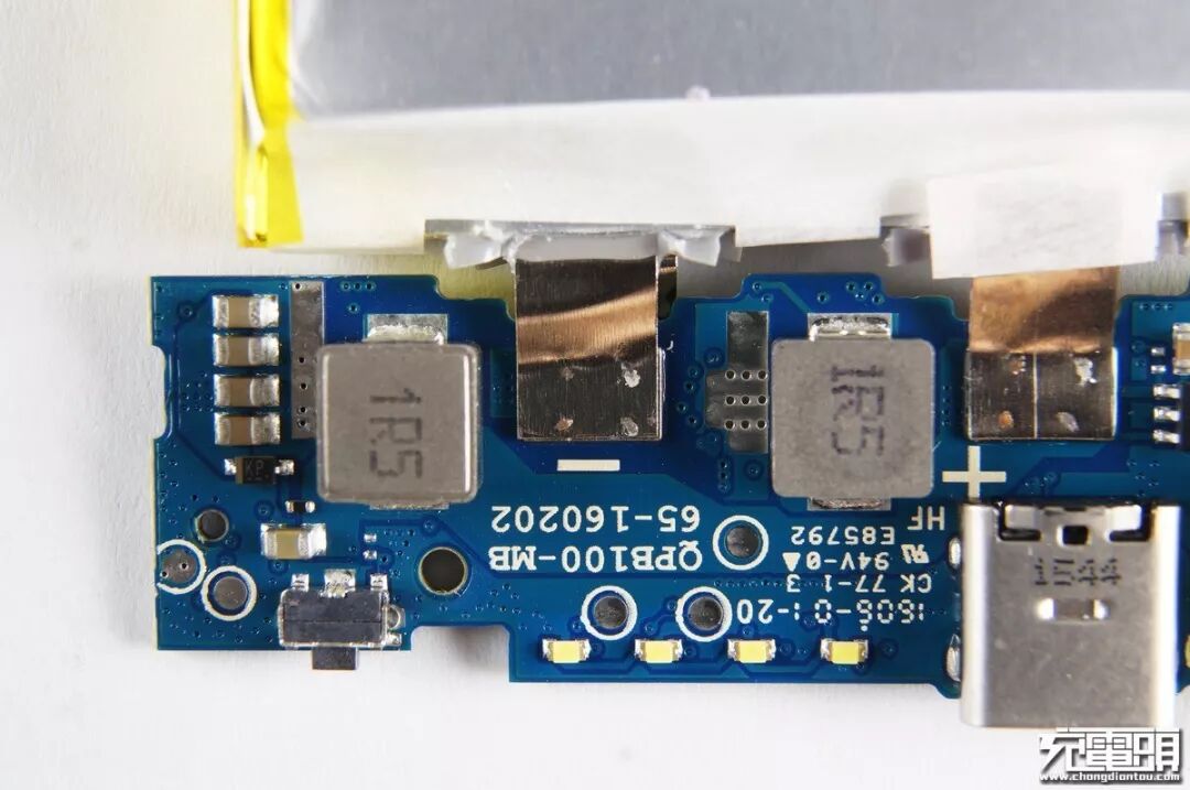 开关按键,4个白色电量指示LED,双电感,支持边充边放。