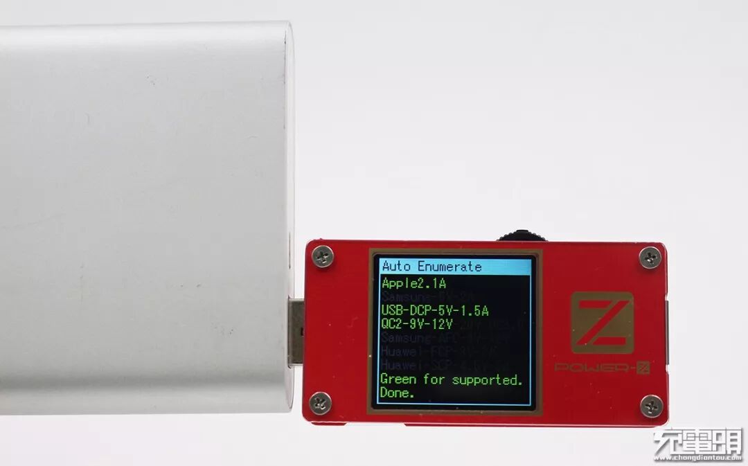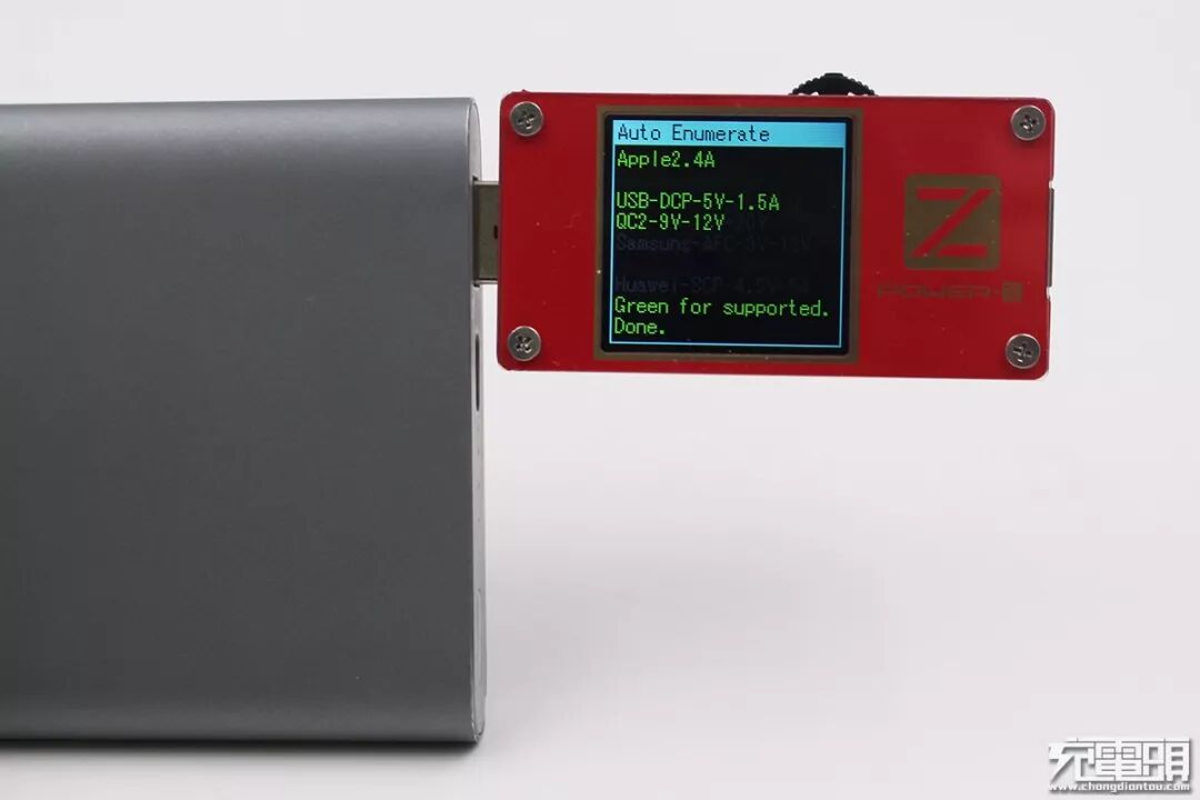 经ChargerLAB POWER-Z KT001测试,新小米移动电源2支持APPLE2.4A、QC2.0以及USB DCP协议。