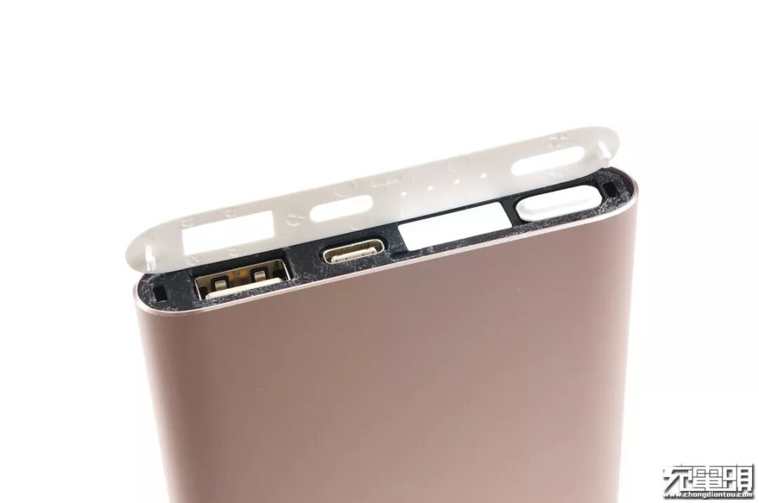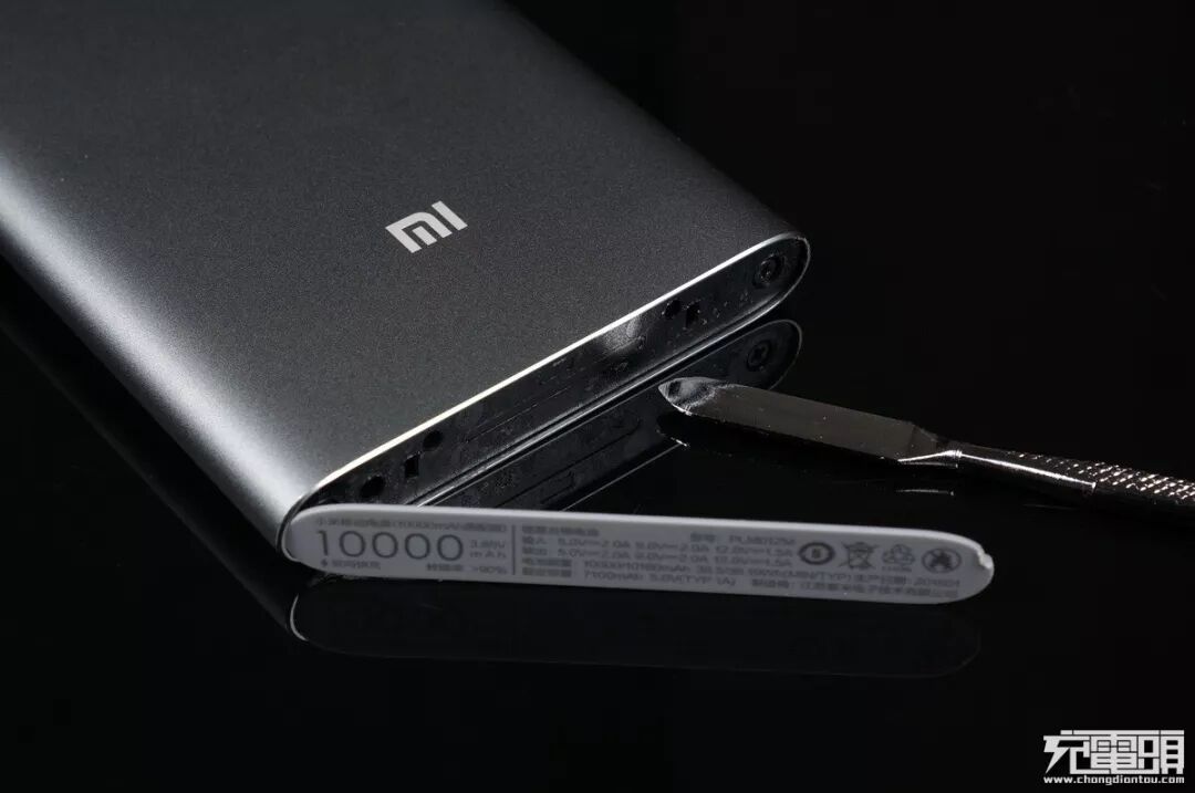小米移动电源2 装配结构与以往金属壳体的几款小米移动电源几乎一样,我们先把顶栏胶面板撬出。