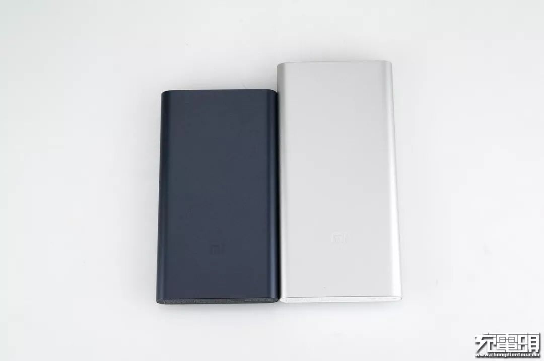 我们把新旧两款产品放在一起作为对比,左边黑色(锖色)的是2016年所推出的“小米移动电源2”,而右边银色的则是2017年推出的“新小米移动电源2”。旧款高度为130mm,新款高度则增加到147mm,两者并排旧款高度明显矮一截。