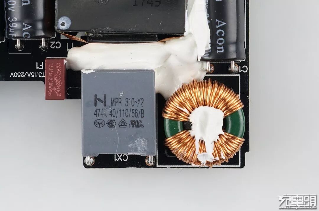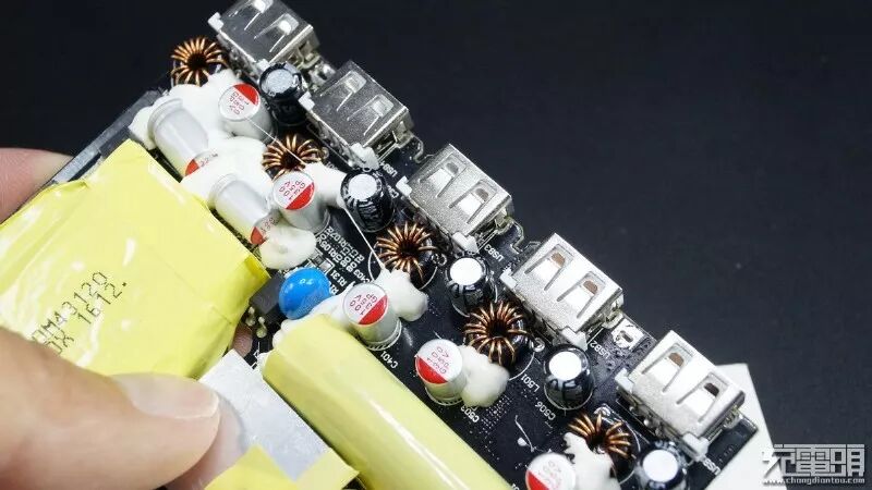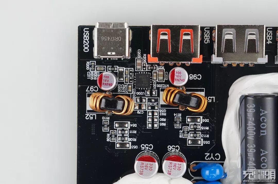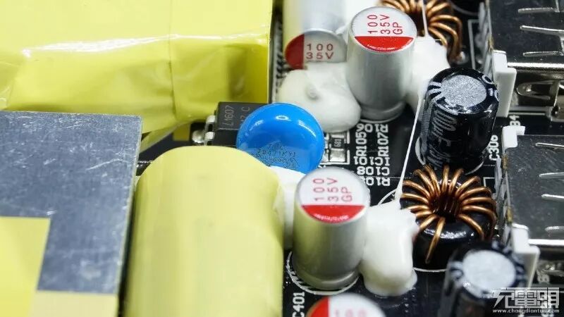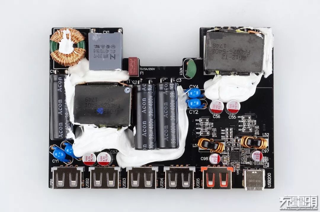 三个中元Acon 400V39μF滤波电容,这个变压器是降压给四个5V2.4A输出口使用,USB口旁带有2个6.3V1000μF固态滤波,两个Y电容避免飘屏。