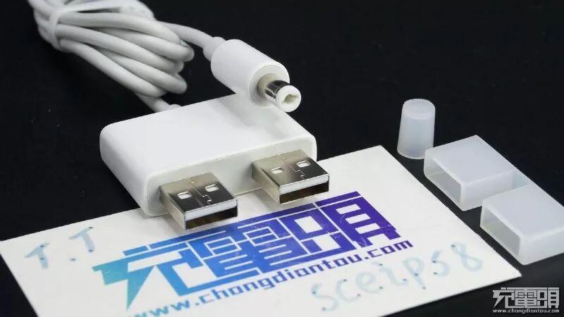 双U电脑适配线,并且插头都有塑料保护帽,通过它可以提供20V输出为笔记本电脑充电。