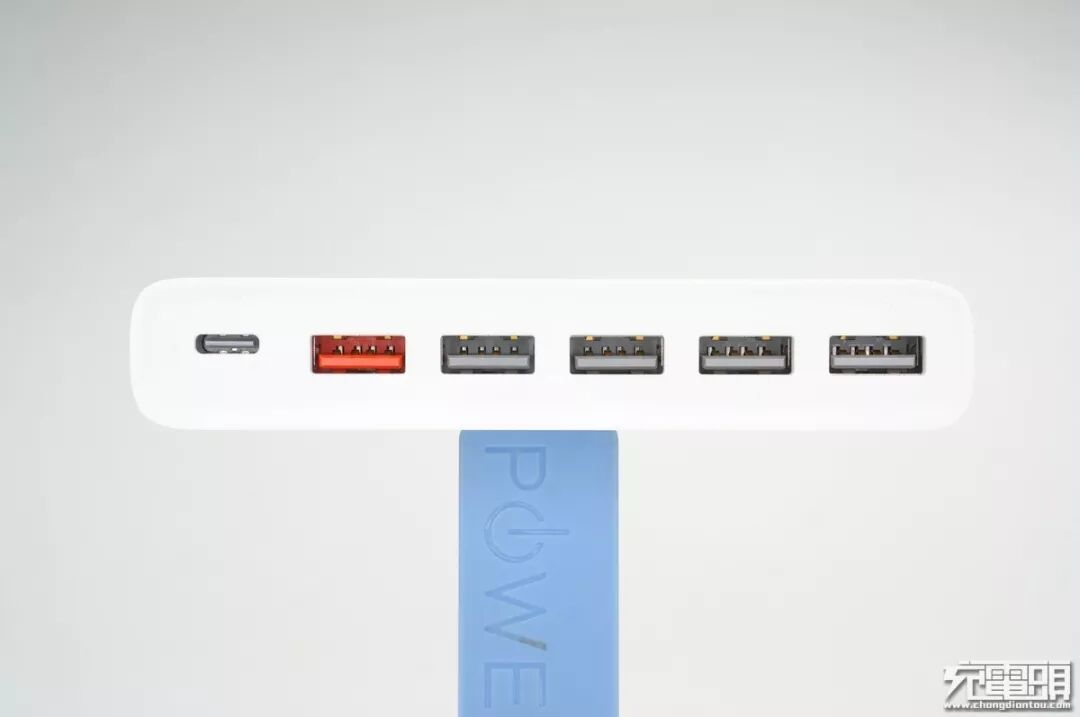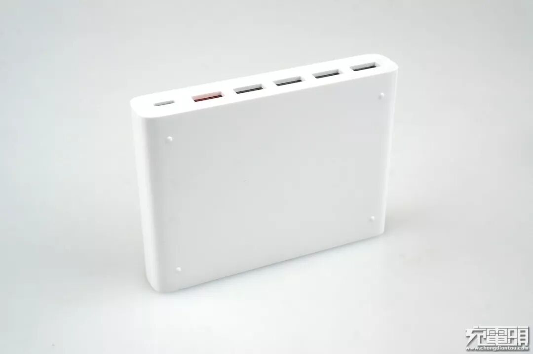输出口全部放在正侧面,从左到右分别是USB-C PD输出口、红色的USB-A QC快充输出口、4个5V2.4A输出口。