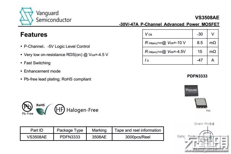Type-C输出口的VBus开关,威兆VS3508AE。