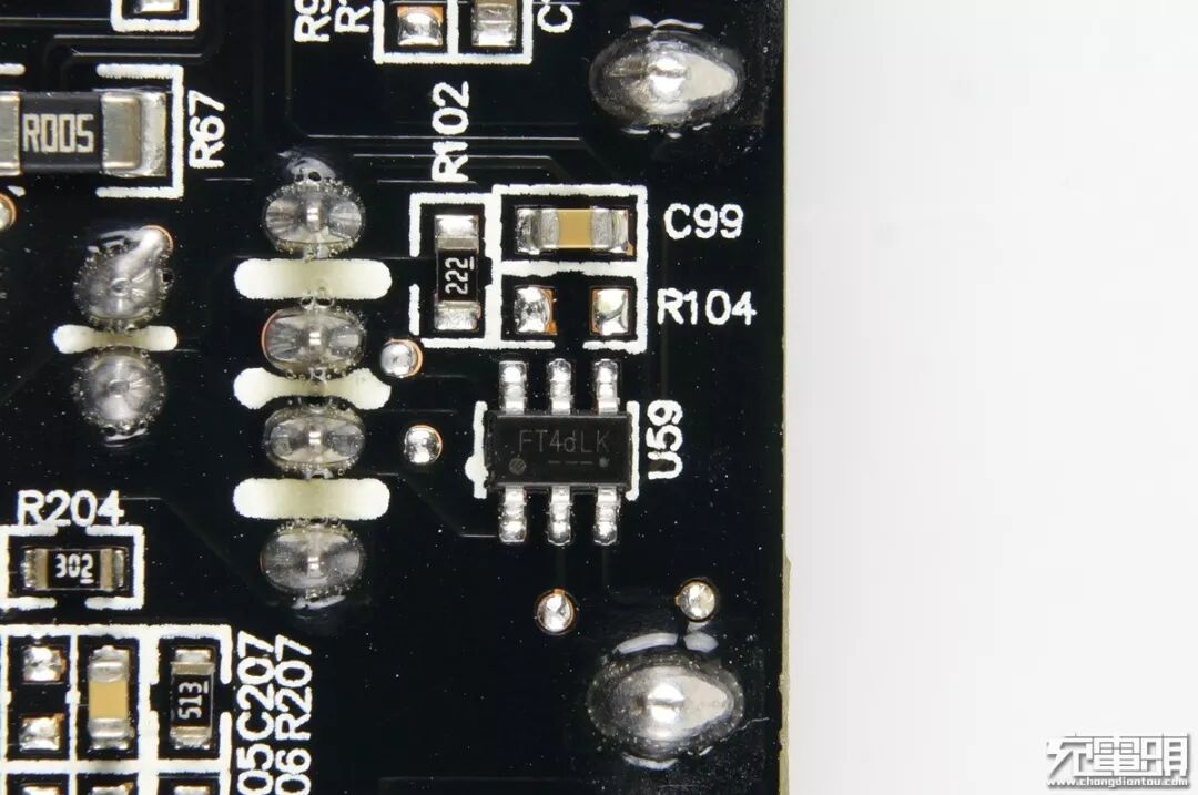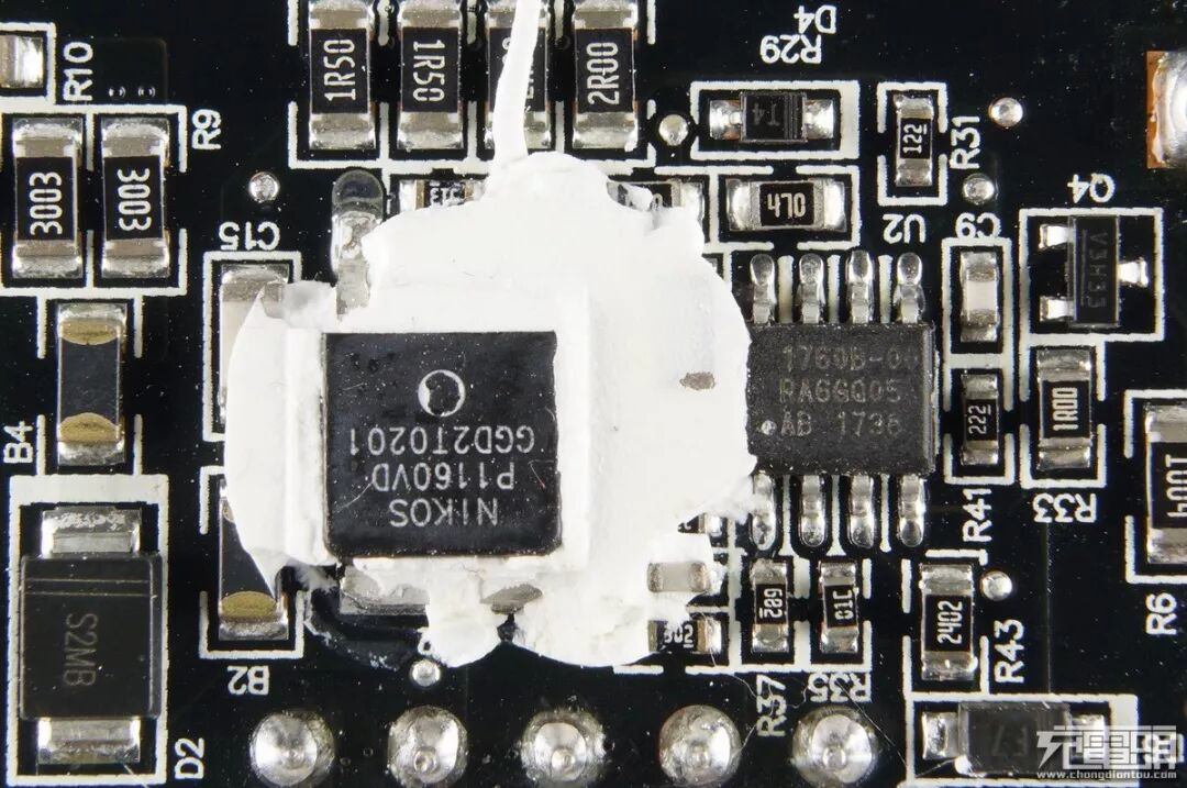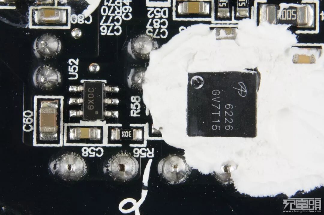 AON6226同步整流管,左侧SOT23元件为同步整流控制器。由于快充两路采用降压输出,采用了100V耐压的管子,导阻8毫欧。