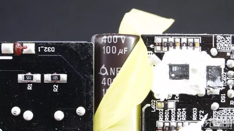 黄色绝缘胶带包裹的细长元件为主电容,旁边的铝制散热片下面是主开关管。