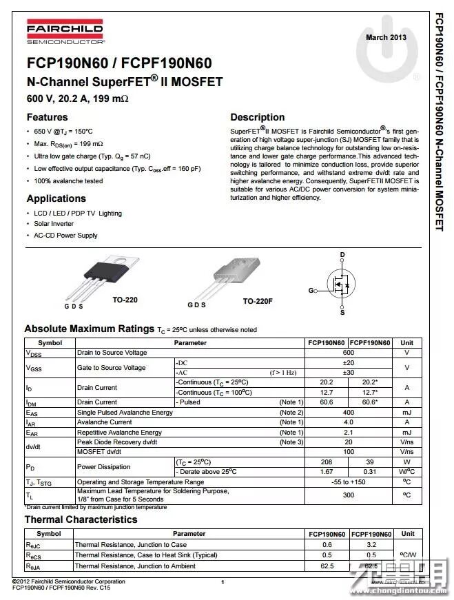 初级主开关管来自美国仙童,型号FCPF190N60 N-Channel SuperFET II MOSFET 600V, 20.2A, 199mΩ导阻很低,有效降低发热。