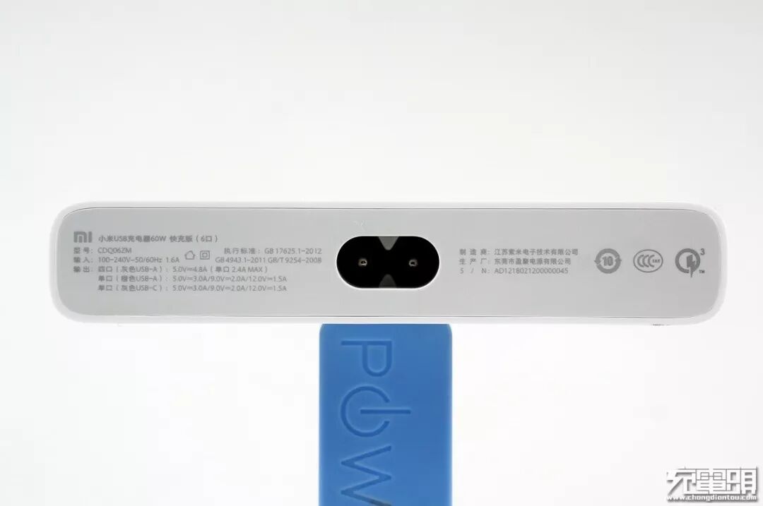 充电器背后铭牌参数如下,品名:小米USB充电器60W快充版(6口)、型号:CDQ06ZM、输入:100-240V~50/60Hz 1.6A、输出:四口(灰色USB-A):5V4.8A(单口2.4A MAX)、单口(橙色USB-A):5V3.0A / 9V2.0A / 12V1.5A、单口(灰色USB-C):5V3.0A / 9V2.0A / 12V1.5A、制造商:江苏紫米电子技术有限公司、生产厂:东莞盈聚电源有限公司。