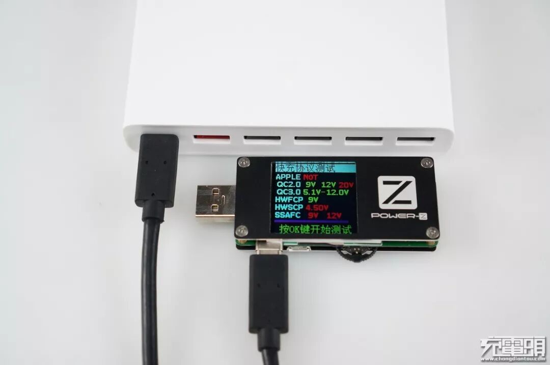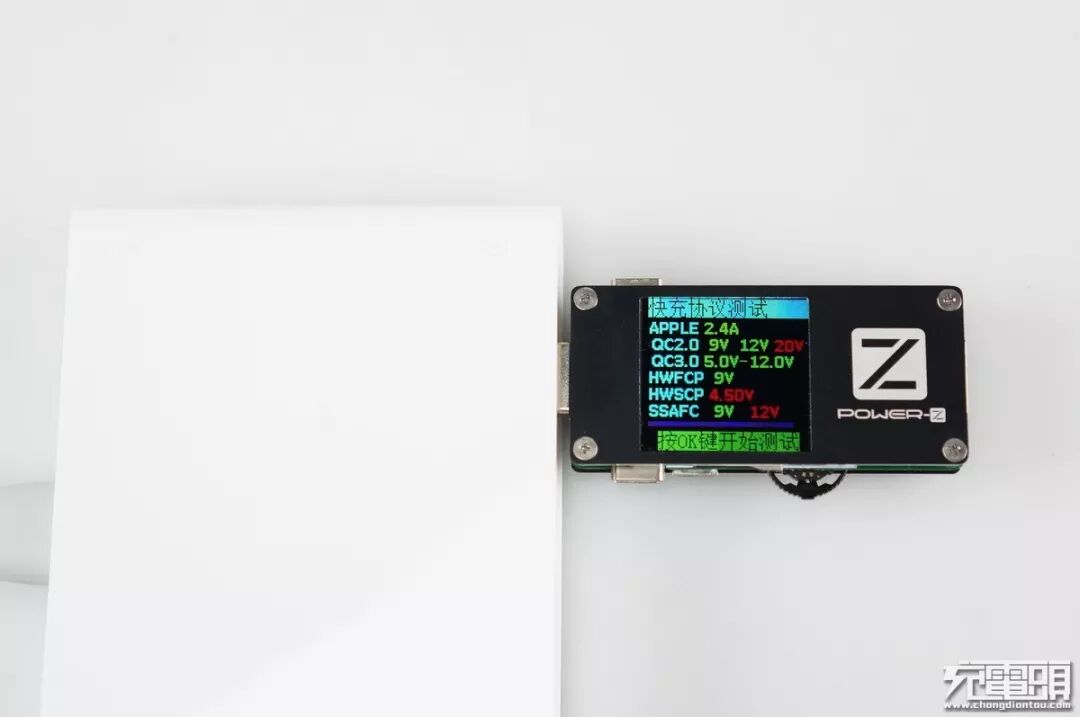 使用 POWER-Z FL001 对QC快充口进行协议识别轮询,据充电头网分析,快充口支持苹果apple2.4A、高通QC2.0 9V 12V、高通QC3.0、华为FCP、三星AFC。