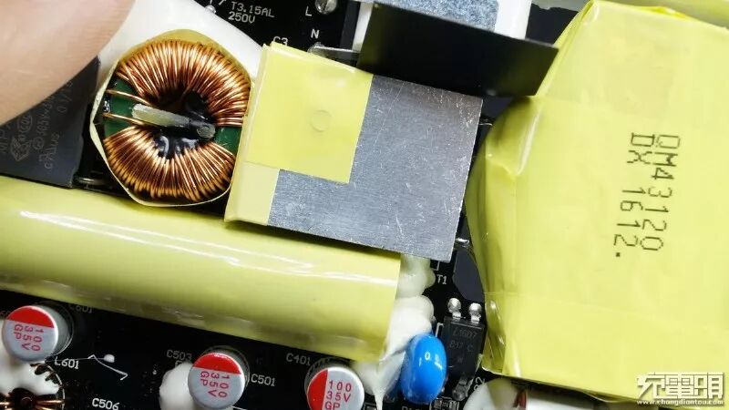 变压器呈饼型很薄但面积大。细长的电容,饼型的变压器等等这些做薄的元件才能成全这么纤薄的电源体积。