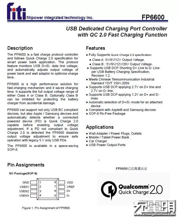 FP6600为台湾天钰QC2.0识别IC,此外还支持BC1.2协议,能给苹果旗下的iPad、iPhone等设备提供全速充电,这样的设计解决了不少手机、平板的充电兼容问题。